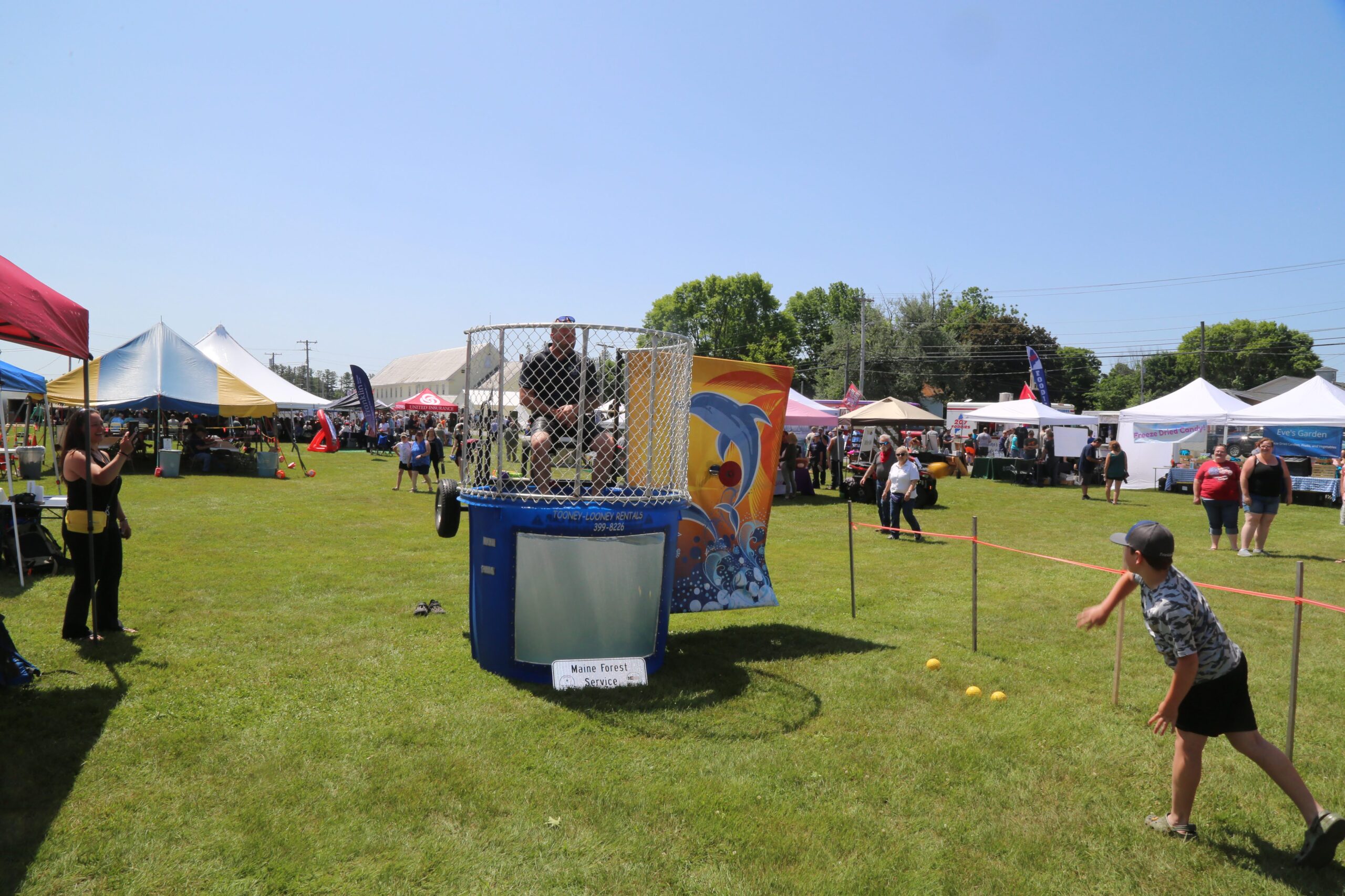 The dunk tank, held from 9 AM to 1 PM during the festival, featured an all-star lineup of local “hotshots” and public officials who volunteered to take the plunge, including Kris MacCabe, Maine Game Warden; Richard Caton, Rangeley Police Chief; Ken Charles, Farmington Police Chief; and Judy Camuso, Maine IFW Commissioner.
